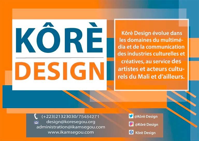 Kôrè Design is the multimedia department of the Institut Kôrè des Arts et Métiers de Ségou (IKAM) with a digital studio. It evolves in the fields of multimedia and digital communication of the cultural and creative industries, serving artists, actors and cultural organizations in Mali and elsewhere.
